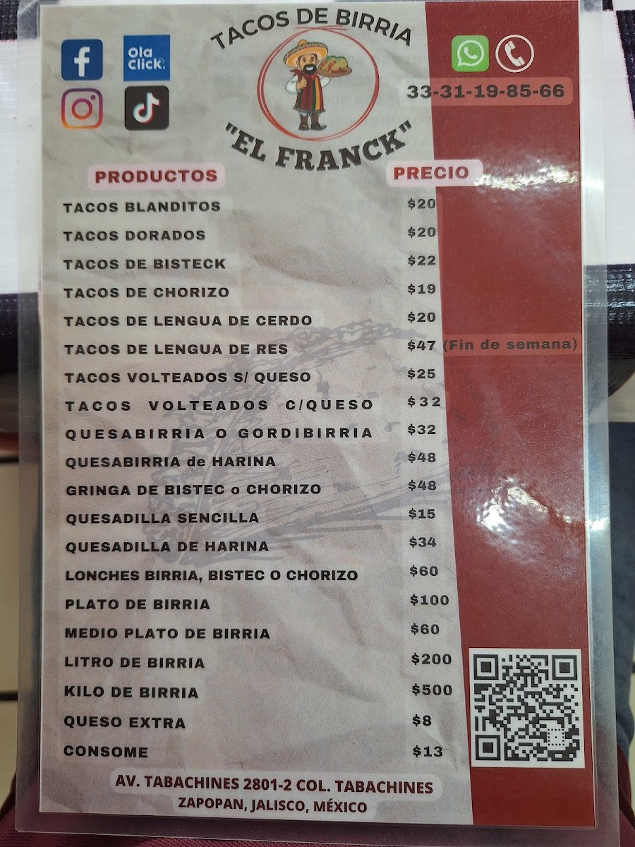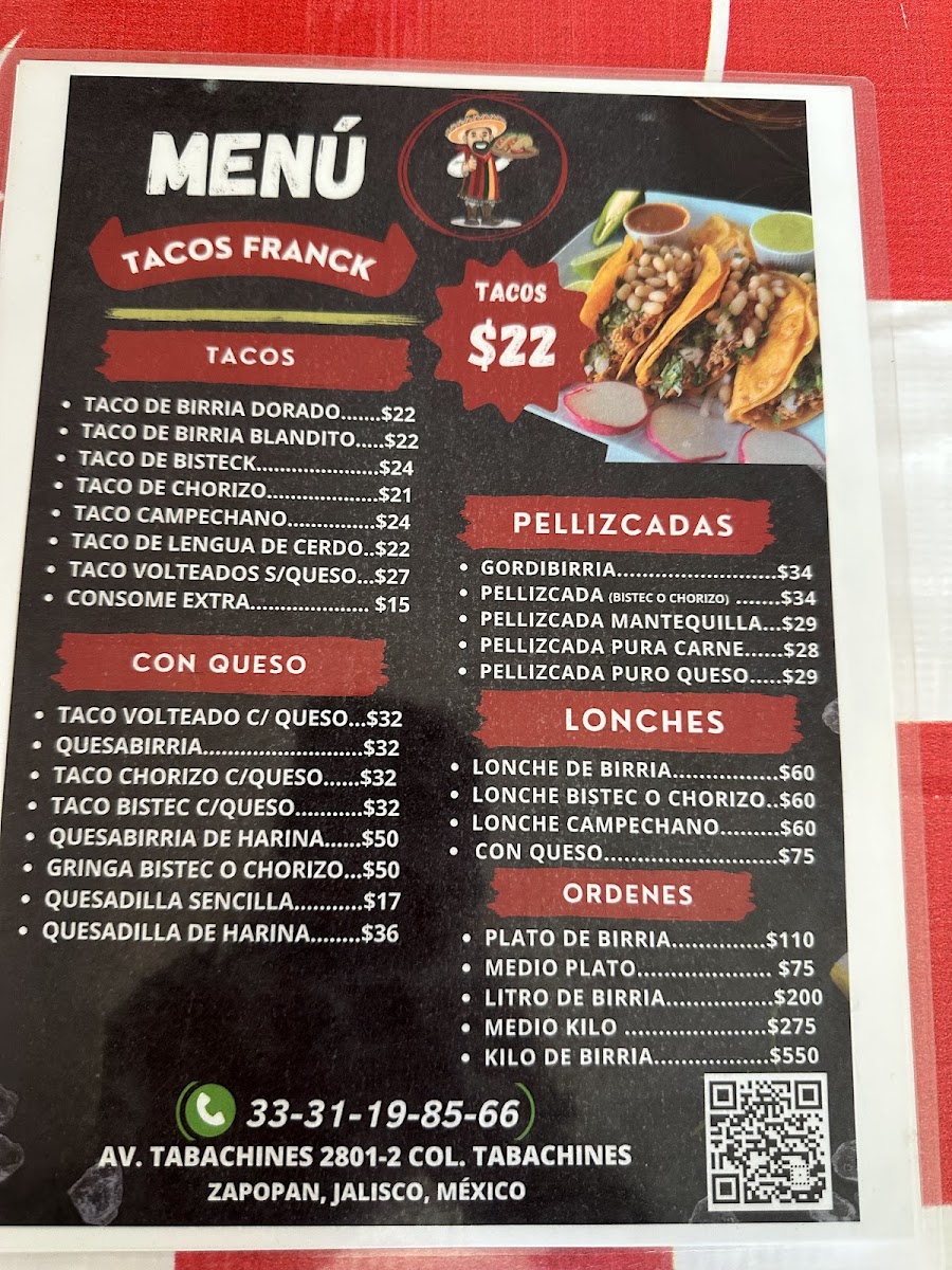 Welcome to Tacos de Birria El Franck, a hidden gem located in Zapopan, Jal. This vibrant destination specializes in mouthwatering birria tacos that have been winning over the hearts of food lovers. Their menu boasts a variety of options, including breakfast dishes and takeout services, ensuring a delightful culinary experience any time of day.